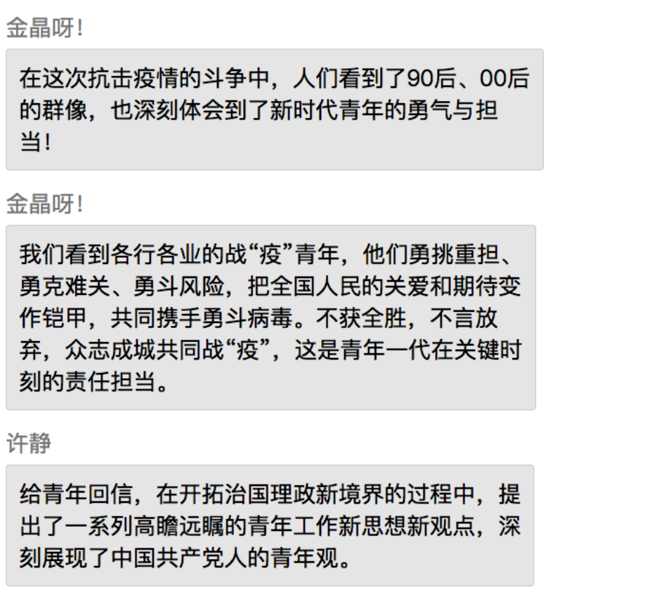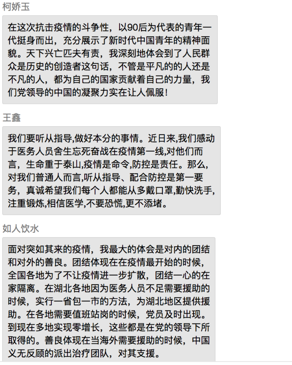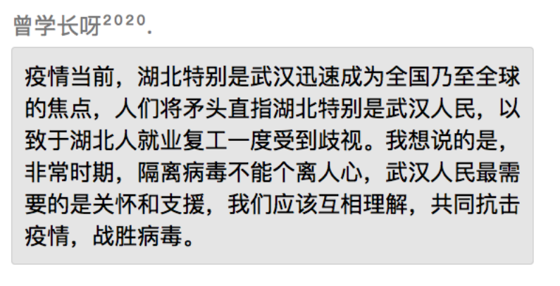 同学们表示,在党中央的坚强领导下,全国上下齐心协力共抗疫情,充分展现了中国特色社会主义制度的强大生命力和显著优越性,再一次见证了气势磅礴的中国力量、万众一心的中国精神和卓有成效的中国速率。作为新时代的中国青年,要勇做走在时代前列的奋进者、开拓者、奉献者,并积极配合政府、公司和社区,为打赢疫情防控阻击战贡献自己的力量。