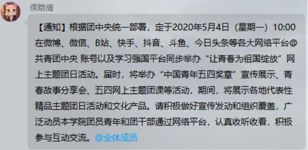 此次直播主要围绕“出彩青春”、“战‘疫’青春”、“奋斗青春”以及“绽放青春”四大篇章展开,既有青春思“享”课、青春故事分享会等思想盛宴,又有各地活动精彩展示、优秀文化产品展播等视觉大餐,鲜明生动地向支部党员展示了百年后全国各地青年爱国担当、团结奋进的青春风采!在积极收听收看共青团中央举办的“让青春为祖国绽放”网上直播后,支部党员纷纷表示,新时代的中国青年应承担属于自身的使命,不惧风雨勇向前,在党和人民最需要的地方绽放青春最绚丽之花。正如习近平总书记寄语新时代中国青年强调“要继承和发扬五四精神,坚定理想信念,站稳人民立场,练就过硬本领,投身强国伟业,始终保持艰苦奋斗的前进姿态,同亿万人民一道,在实现中华民族伟大复兴中国梦的新长征路上奋勇搏击。”