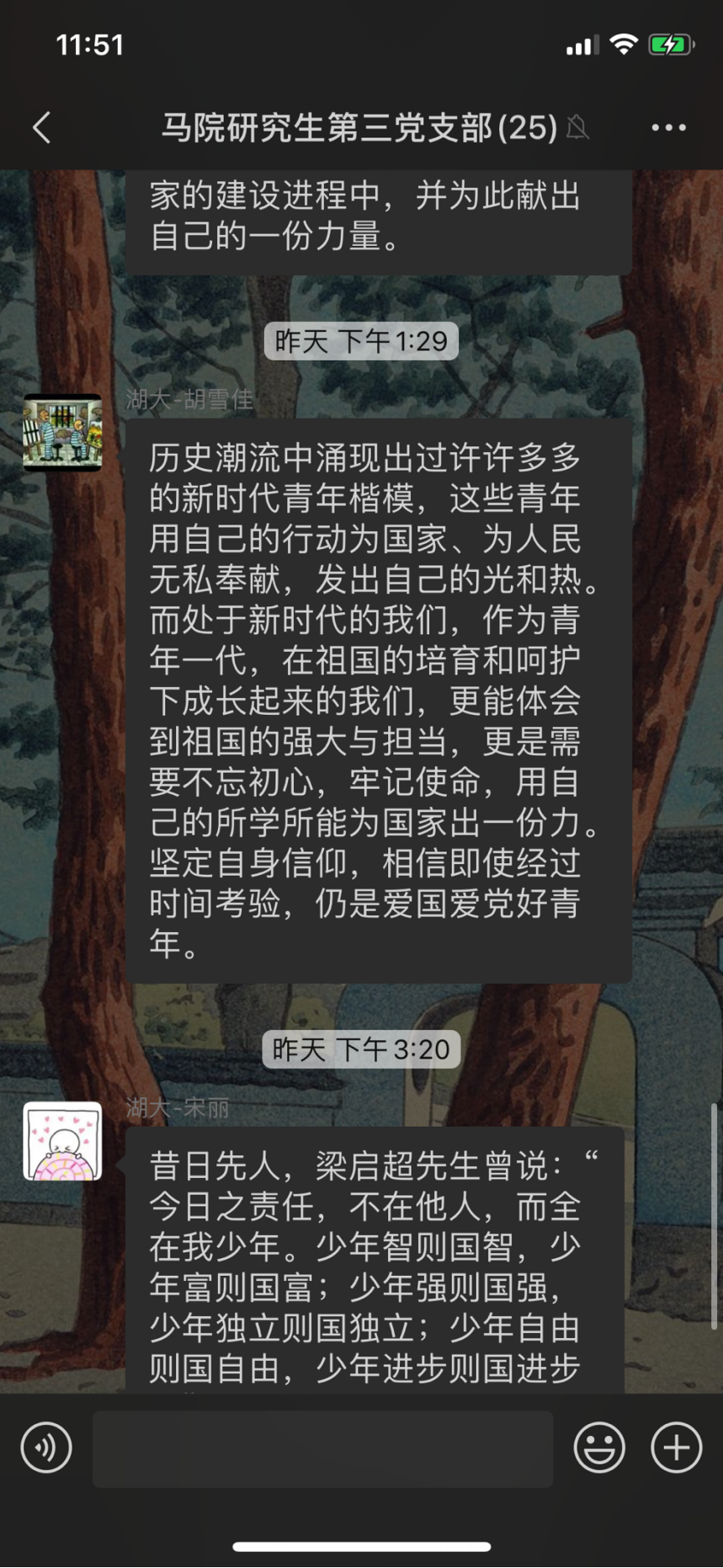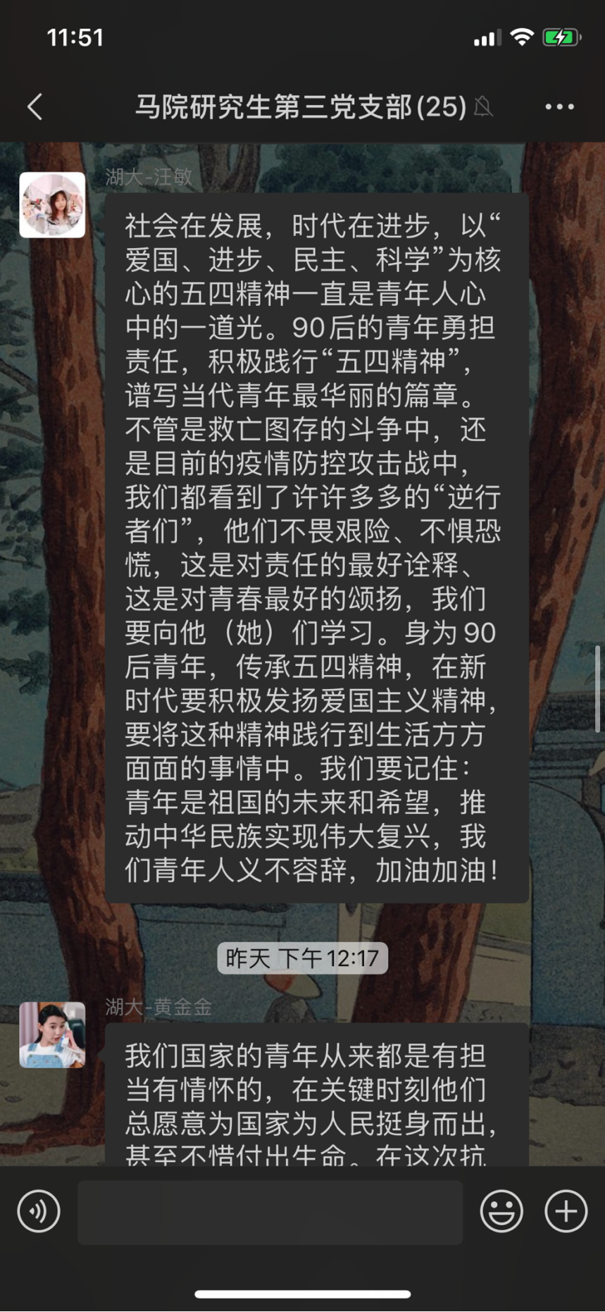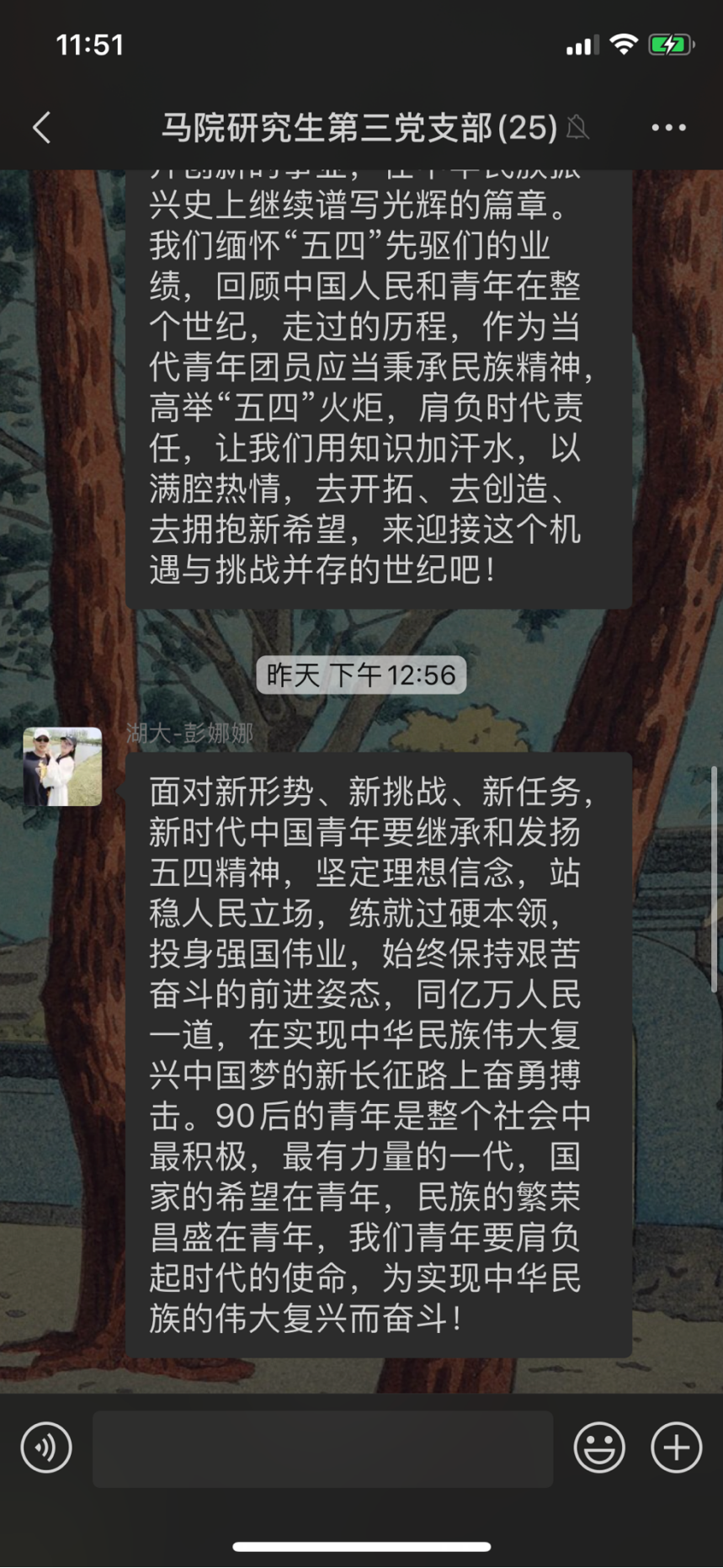 谭哲说,“青年是整个社会力量中最积极、最有生气的力量,国家的希望在青年,民族的未来在青年。”新时代新征程,青年人朝气蓬勃, 是全社会最富有活力、最具有创造性的群体。“少年富,则国富;少年强,则国强”,历史充分证明,青年始终是我们社会中最积极、最活跃、最有生气和活力的一支力量,我们事业所取得的任何成就,都是与青年人的努力奋斗分不开的。我辈青年作为时代的先锋,肩负着历史的重任,承载着党和人民的深切厚望。更需要继承弘扬“五四精神”,在党的领导下勇做走在时代前列的奋进者、开拓者、奉献者,以执着的信念、优良的品德、丰富的知识、过硬的本领,传好我们这一代的接力棒,同全国各族人民一道,担负起历史重任,让五四精神放射出更加夺目的时代光芒,为中国梦汇聚起强大的青春力量。五四精神薪火相传,历久弥新;青年一代重任在肩,前程似锦。