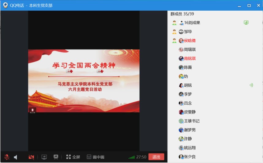 2020年6月6日晚上19时,William希尔官网入口本科生党支部通过QQ群语音会议的形式开展线上主题党日活动,活动主题为学习贯彻全国两会精神。支部全体党员参加活动,公司党委副书记王雄、组织员邹浩列席,主题党日活动由本科生党支部组织委员刘成果主持。