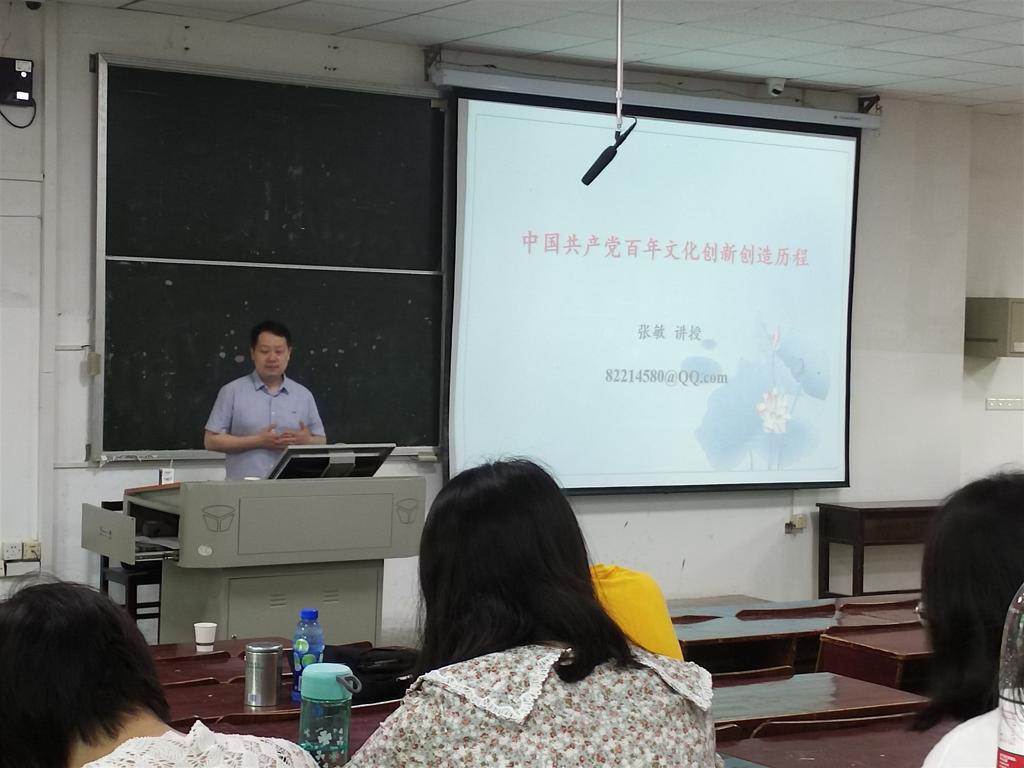 5月14日下午,在教三101教室,历史文化公司张敏副教授为公司17、18、19级员工讲授了以"中国共产党百年文化创新创造历程"为主题的形势与政策课。