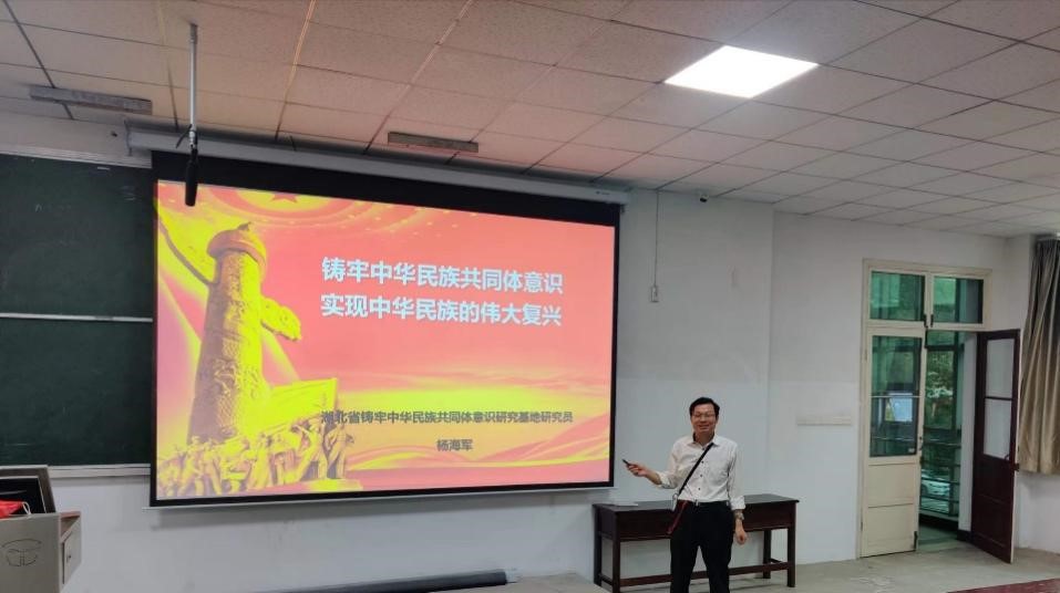 授课过程中,杨海军给同学们详细介绍了中央民族工作会议精神、在党的坚强领导下我国民族工作取得的辉煌成就、高校做好“铸牢中华民族共同体意识”相关工作的要求,并引导同学们学习领悟我国民族工作实践中的历史智慧。他勉励同学们,作为新时代的老员工,应自觉学习马克思主义民族观和习近平总书记在中央民族工作会议上的讲话精神,铸牢中华民族共同体意识,维护民族团结,为实现中华民族伟大复兴的中国梦奉献青年力量。