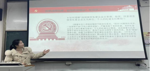 在完成重温入党誓词、交纳党费、诵读党章等规定动作后,支部宣传委员杨韵怡同志带领大家共同进行“抵制违规吃喝,加强作风建设”专项学习。会议强调通过在支部主题党日活动中集中学习,引导党员干部守规矩、知敬畏、明底线、作表率。