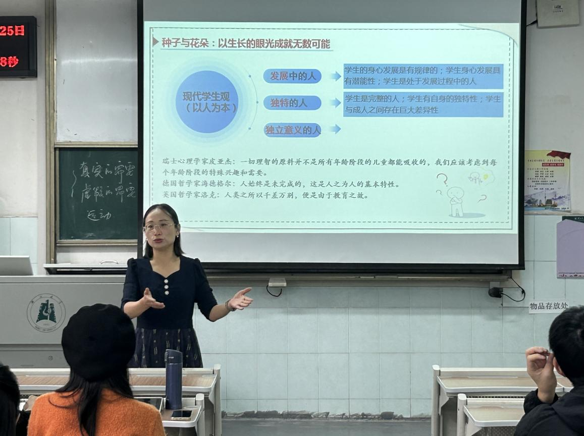 陈丽老师从“享受教师的尊严和幸福”“扎扎实实立足课堂”两个方面展开此次讲座。讲座上,她利用教育家精神的价值内涵向同学们讲述了教师的责任与使命,引导同学们树立正确的教师观;利用教学一线情境化教学的优秀范例向同学们展示了上好一堂思政课所要注意的细节,引导同学们树立良好的教学观。此外,陈丽老师特别强调了教师群体思想的重要性,她结合法国著名思想家帕斯卡《思想录》当中的内容,对在场同学提出忠告,作为一名优秀的高中政治老师除了向员工传授知识外,还要做好员工的思想引领工作。