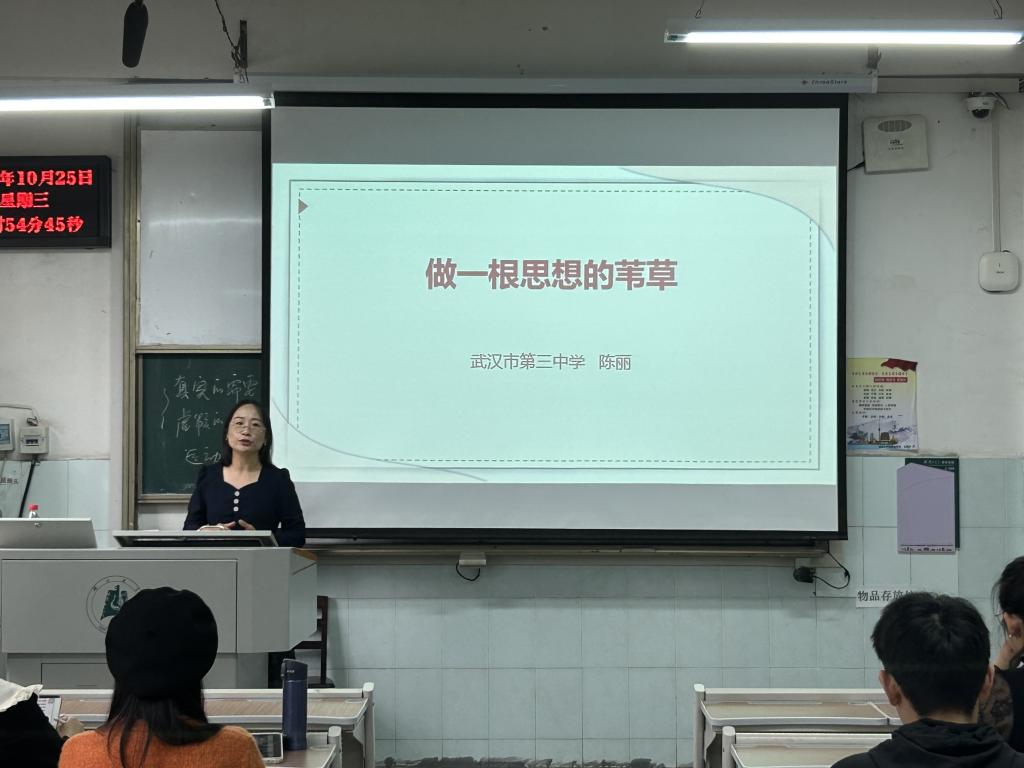 10月25日上午,武汉市第三中学思想政治课优秀教师陈丽老师应邀为为公司2022级学科教学(思政)研究生作题为“做一根思想的苇草”的专题讲座,给即将步入教师岗位的同学们传授实际教学经验。22级学科思政研究生全体同学参加此次讲座。讲座由程亚勤老师主持。