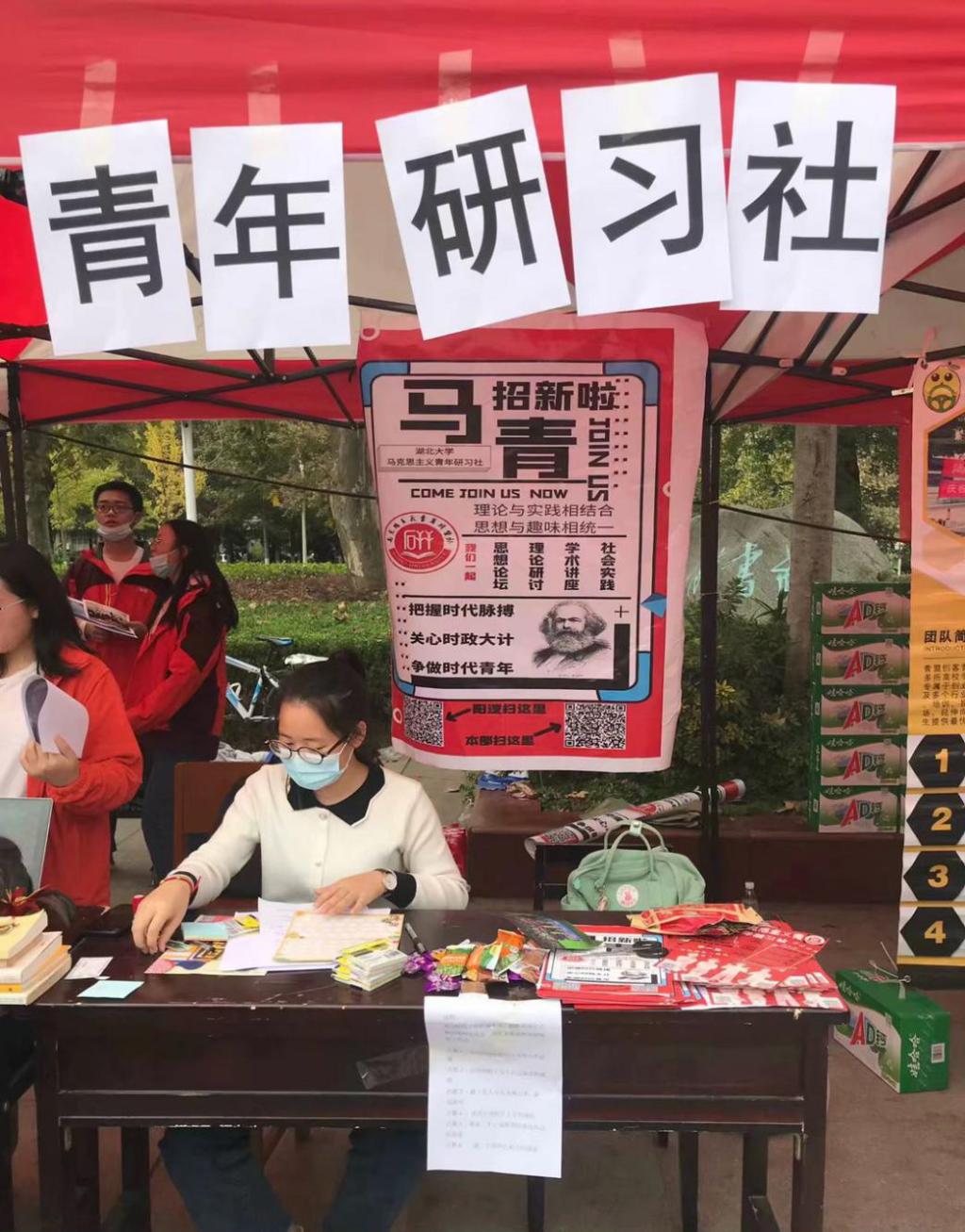 招新当日,马克思主义青年研习社的干事们早早来到会场,有条不紊地完成了摊位的布置,游戏环节设置等工作,满怀信心与热情展开本次招新工作。