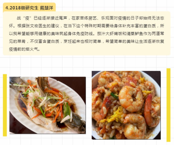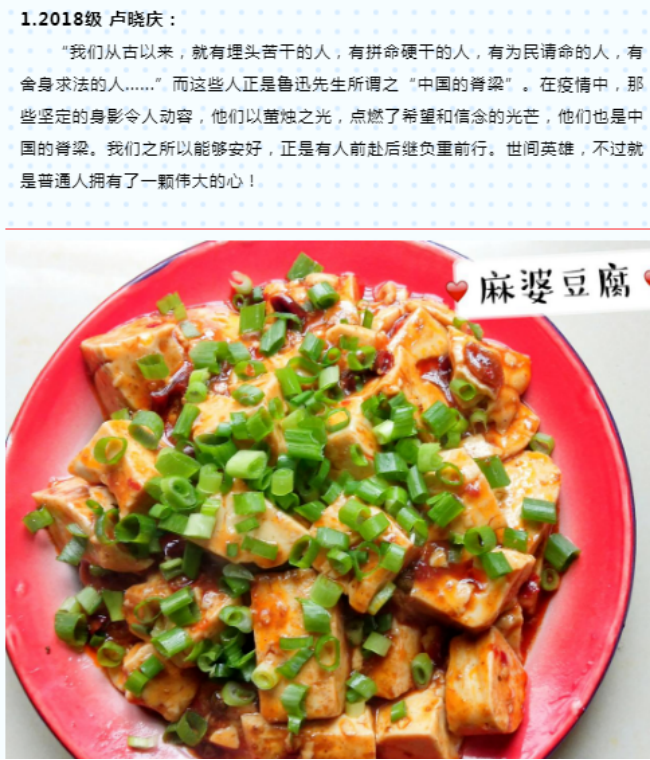 活动通知一经发出,便得到广大同学的积极响应。大家克服疫情期间出行不便、采购食材不方便等实际困难,围绕主题充分发挥自己“厨艺”特长,不仅仅只为比赛,而是浓缩了在疫情防控的特殊日子马院员工为家人奉献的“大餐”。
