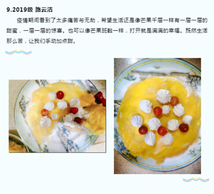 理论是基础,实践出真知。参赛者们饱含理论知识,却难得动手一试。这次比赛给他们一个机会,他们的菜品可谓色香味俱全。2019级本科生路云洁从厨房感悟人生,她写道:疫情期间看到了太多痛苦与无助,希望生活还是像芒果千层一样有一层一层的甜蜜,一层一层的惊喜。也可以像芒果班戟一样,打开就是满满的幸福。既然生活那么苦,让我们手动加点甜。