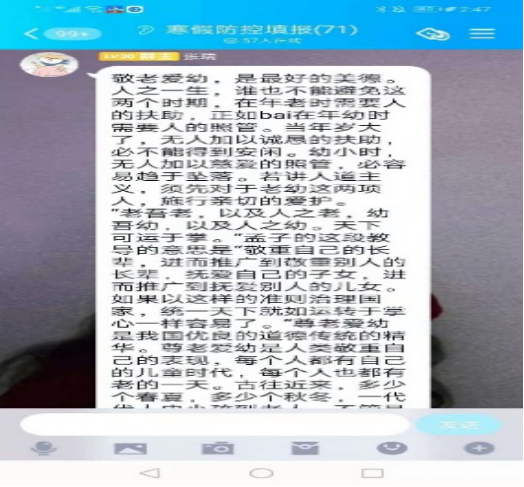 2月7日晚,18级思想政治教育班通过QQ进行了线上班会,同学们准时在线上进行签到。这次班会的主要内容是弘扬中华民族传统美德。