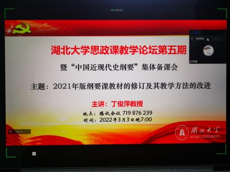 本次集体备课研讨会的主题是“2021年版纲要课教材的修订及其教学方法的改进”,会议邀请了武汉大学二级教授、博士生导师、2021年版纲要教材编委丁俊萍教授进行主讲。丁俊萍教授依据2021版教材的修订精神、涵盖教材框架结构和各版块内容、反映中国共产党百年奋斗的成就和经验以及体现思政课教学特点的原则,从教学设计的原则、思路、课堂教学设计、实践教学设计、线上教学设计、需要注意的问题六个方面,与大家分享了对“中国近现代史纲要”教材使用和教学设计的若干思考。在互动环节大家踊跃提问,询问丁老师关于新教材内容变动原因、如何填平文理科员工知识不均衡的鸿沟、怎样建设慕课以及如何解决马院与历史公司学科设置冲突等问题,丁老师一一给予答复。