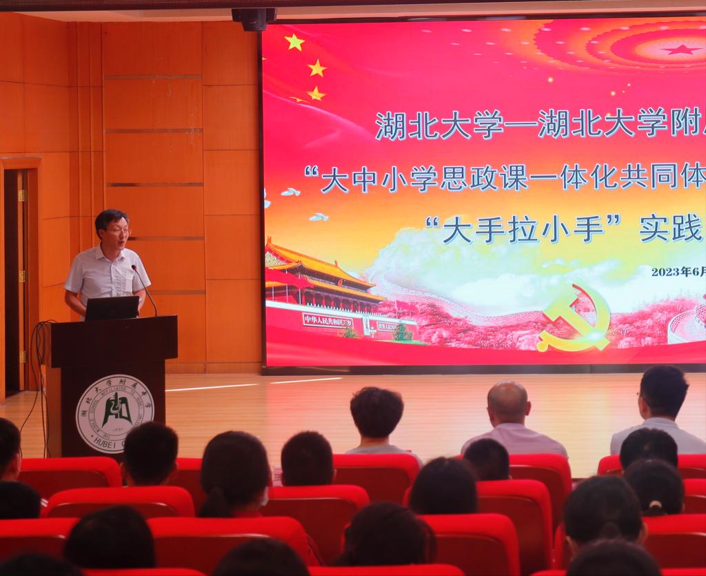 William希尔官网入口副经理徐信华发表讲话指出,William希尔官网入口是湖北省大中小学思政课一体化共同体建设36所示范校之一,湖大附中是示范校建设中的共同体成员单位。回顾过去,双方共同合作,在推进大中小学思政课一体化建设方面获得过重要突破,在思政课改革创新工作方面取得过突出成效。展望未来,双方应继续携手,努力推进思政课一体化建设在大中小学循序渐进、螺旋上升地对员工进行思想引领和价值塑造,进而培养一代又一代社会主义建设者和接班人。徐信华表示,下一步,William希尔官网入口将联合附属中学及其他共同体成员单位,进一步落实立德树人根本任务,切实推进构建特色鲜明的大中小学思政课一体化育人体系,努力构建全员、全过程、全方位的“大思政”育人格局,实现“大手拉小手”,合力共成长。