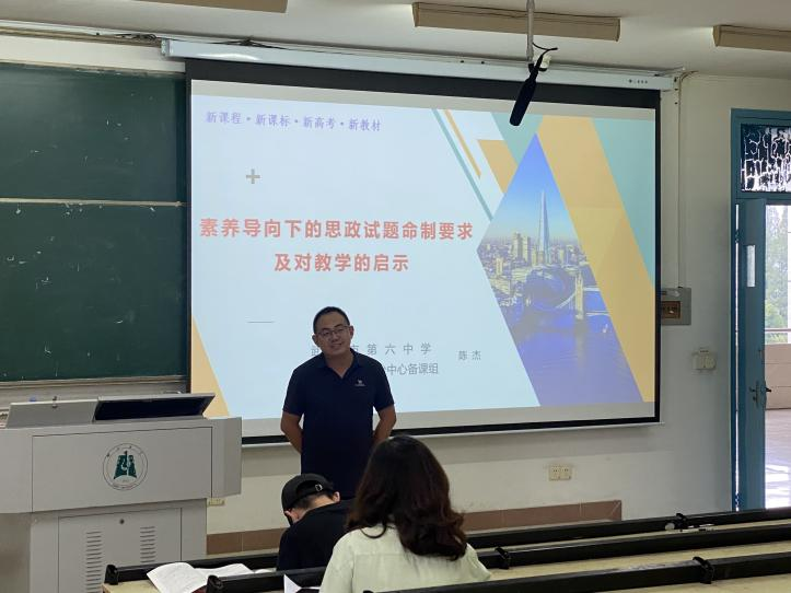 高中思想政治课程是落实立德树人根本任务的关键课程,以培育社会主义核心价值观为目的,是帮助员工确立正确的政治方向、提高思想政治学科核心素养、增强社会理解和参与能力的综合性、活动型学科课程。陈杰老师在讲座中分析了素养导向下的思政试题命题的特点与要求,并给予同学们有关教学的建议。