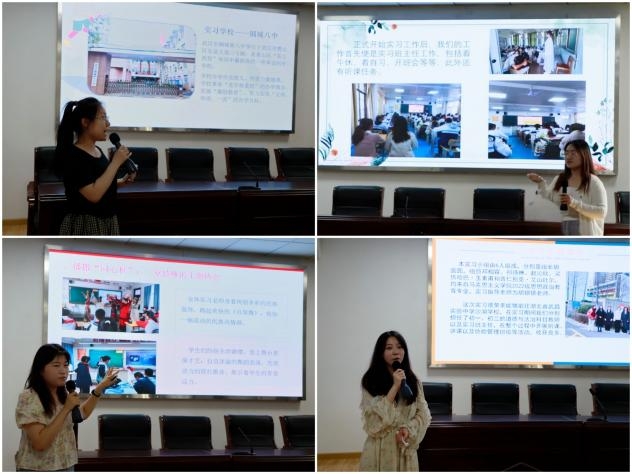 会议伊始,胡银银老师对顺利完成实习工作的各小组表达了祝贺。随后,2022级17个实习小组代表依次上台汇报实习成果:“让花成花,让树成树”从萌芽到生长再到开花,小小的种子在心中逐渐成长;“我在中学当老师”以实习生的视角展开对一天工作的介绍,凝结着教师的使命担当;“播撒‘同心种’”一堂特殊班会课的开展,让员工在民族团结中领会独特的文化魅力;“与四美塘相yu”以“遇师、育人、愉行、寓教、愈己”为线索,分享从员工转向教师的成长经验……这些不同的汇报主题凝聚着同学们在实习过程中的独特体验,体现着他们的成长与收获。
