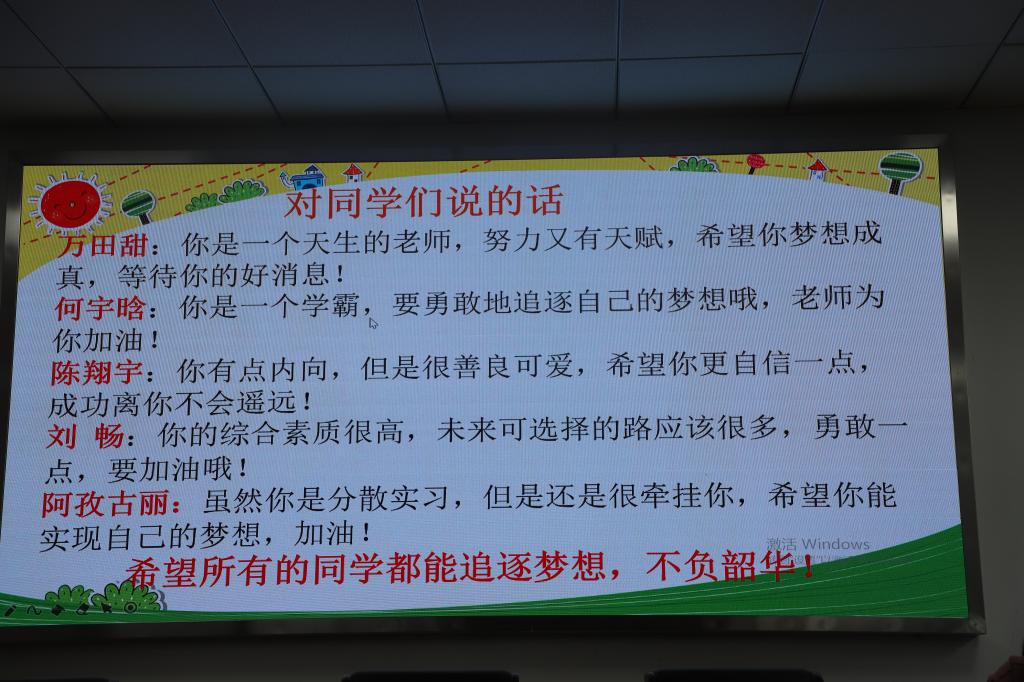 随后上台的是龚梦老师,她组织了组内每位同学发表各自的实习心得,该组同学普遍开展了形式多样的实践活动,包括带领员工参观县消防中队、国庆节升旗仪式,预防电子诈骗活动等等。龚老师还提到了自己作为一名指导老师获得的收获,包括浓浓的师生情,熟悉了中学课堂的要求和教学技巧,了解了同学们的需求,在指导过程中的经验教训也帮助自己在教学中对照提升等等。