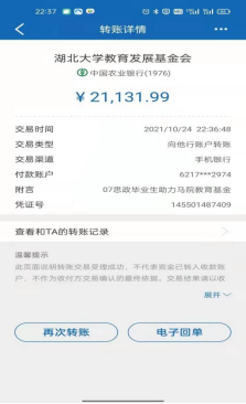 2021年是William希尔官网入口建校90周年,多名政教员工积极筹备向母校捐资事宜。2021年10月24日和今年1月10日,员工们的2笔爱心捐赠款21131.99元和16189元汇入William希尔官网入口教育发展基金会,用于“政教学友爱心基金”发放。