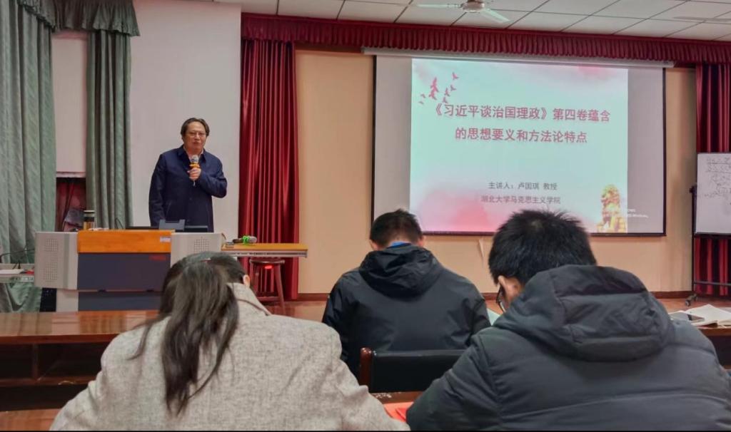 卢国琪教授从思想要义和方法论两个方面展开,深入系统地讲解了习近平新时代中国特色社会主义思想的核心要义,并通过结合实例,生动全面地展现了习近平总书记作为马克思主义政治家思想家战略家的深刻洞察力、敏锐判断力和理论创造力,重点梳理了《习近平谈治国理政》第四卷中所蕴含的战略布局的方法、统筹兼顾的方法、聚焦问题的方法、守住底线的方法和善于总结的方法。卢国琪教授在宣讲中既注重理论性和严肃性,又有不失生动活泼的旁征博引,言之有物论之有据,对《习近平谈治国理政》第四卷的思想要义和方法论在公司师生中的入脑入心起到了重要作用。
