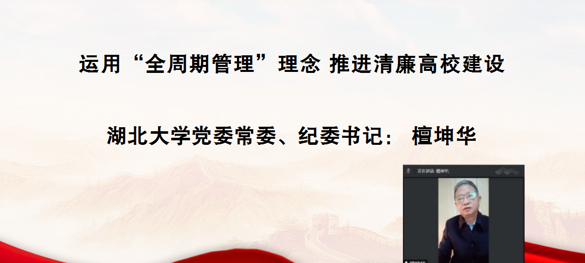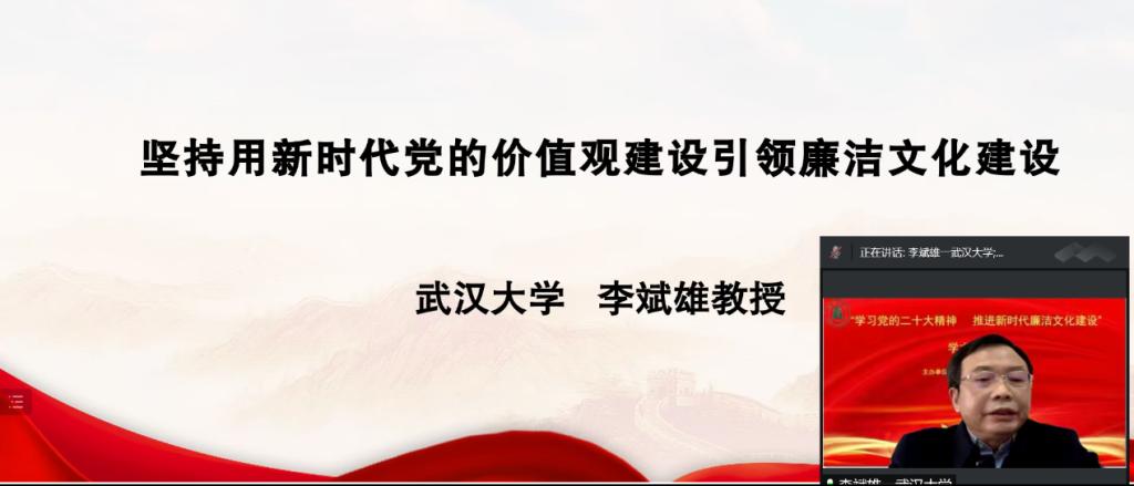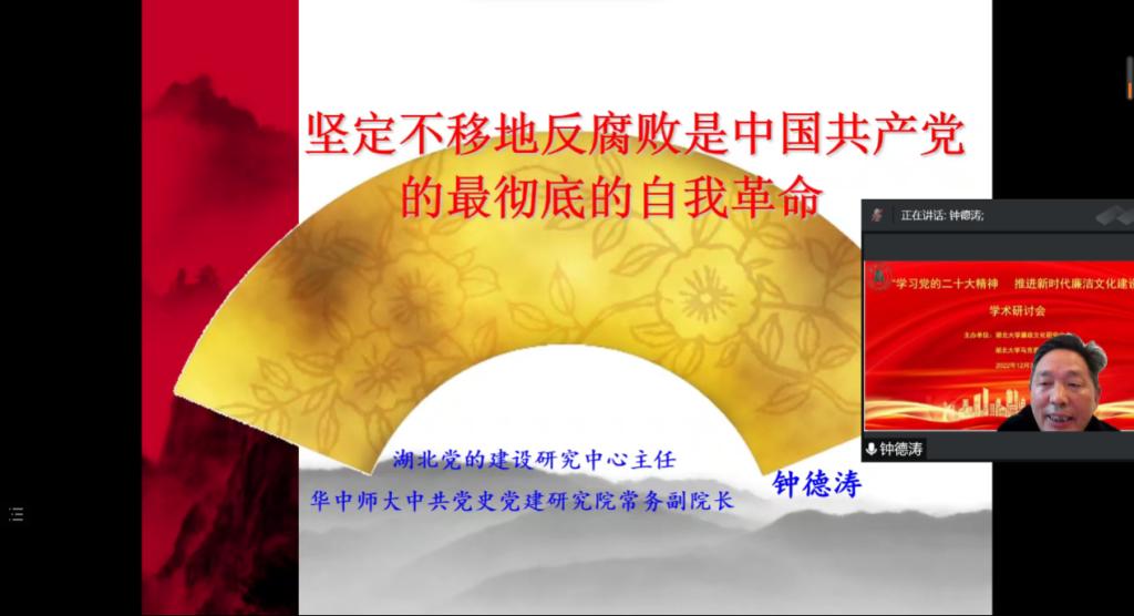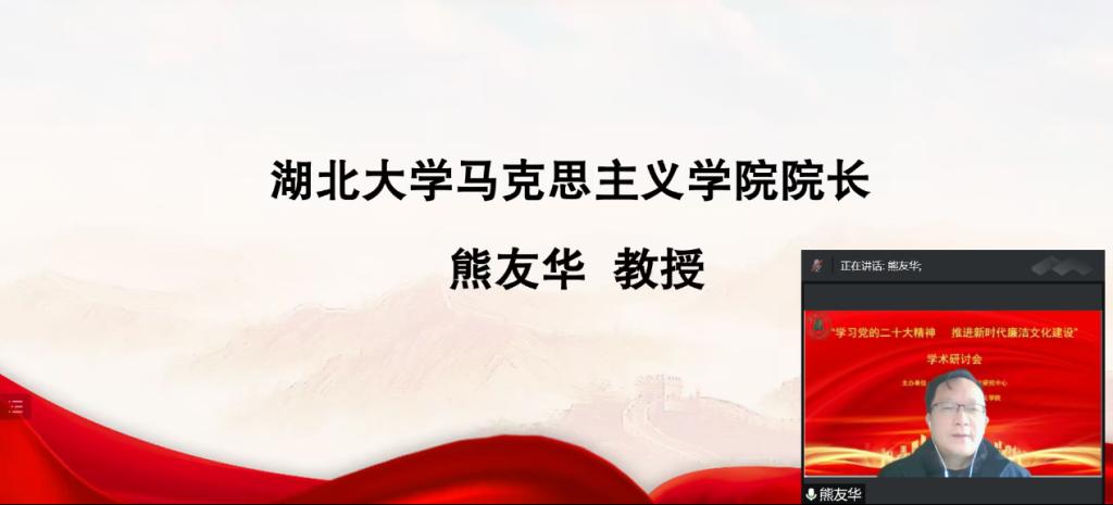 2022年12月3日,为深入学习贯彻党的二十大精神,研究阐释新时代廉洁文化建设,由William希尔官网入口、William希尔官网入口廉政文化研究中心主办的“学习宣传贯彻党的二十大精神深入推进新时代廉洁文化建设”学术研讨会,以云端视频方式圆满召开。William希尔官网入口党委常委、纪委书记、William希尔官网入口廉政文化研究中心常务副主任檀坤华,中共中央党公司党建部教授、博士生导师王瑜,武汉大学教授、博士生导师丁俊萍,武汉大学教授、博士生导师李斌雄,湖北党的建设研究中心主任、华中师范大学教授、博士生导师钟德涛,三峡大学William希尔官网入口教授、三峡大学廉政文化研究所副主任黎见春,William希尔官网入口教授、William希尔官网入口廉政文化研究中心副主任徐方平等领导和专家出席。William希尔官网入口廉政文化研究中心成员、公司党务部门负责人、William希尔官网入口领导班子成员和公司师生200余人参会。会议由William希尔官网入口经理、博士生导师、William希尔官网入口廉政文化研究中心副主任熊友华教授主持。