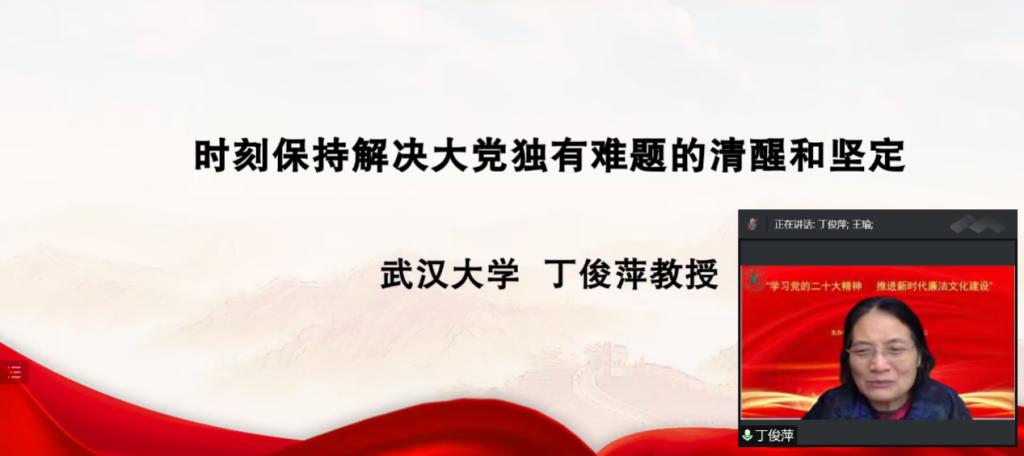 丁俊萍教授围绕《时刻保持解决大党独有难题的清醒和坚定》,指出这个命题是我们党对新时代新征程上如何建设长期执政的马克思主义政党这一重大时代课题的思考与回答。她分析了党的二十大提出这个命题的三个原因:一是始终要赢得人民拥护、巩固长期执政地位优势的需要;二是统筹国内国际两个大局,把握发展安全两件大事的客观需要;三是全面建设社会主义现代化国家,始终保持中国特色社会主义这艘巍巍巨轮行稳致远的需要。她强调,目前我们这个大党面临着保持长期执政地位、全面领导、自身建设、推进伟大社会革命、治国理政五个方面的难题。最后,她从坚持党的领导、坚持自我革命、践行“三个务必”的视角出发,提出了解决这些难题的措施。