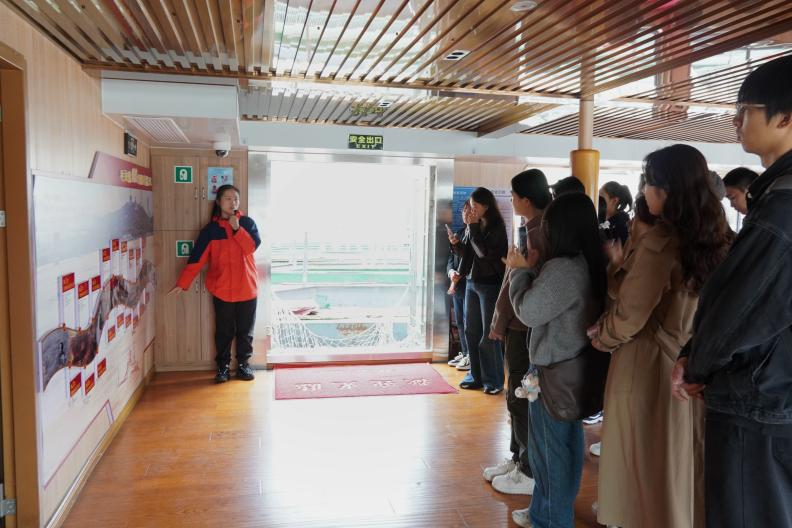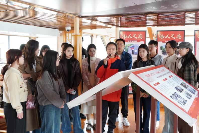活动伊始,成员们参观了船舱一楼的红色氛围展示区。讲解员以毛泽东同志在武汉的革命经历为主线,带领大家从“武昌中央农民运动讲习所”到“‘八七’会议在汉口召开”等历史事件,重温了伟人的革命历程。毛泽东同志曾18次畅游长江,并在此期间写下了《水调歌头·游泳》,这让大家深刻体会到伟人的革命情怀。