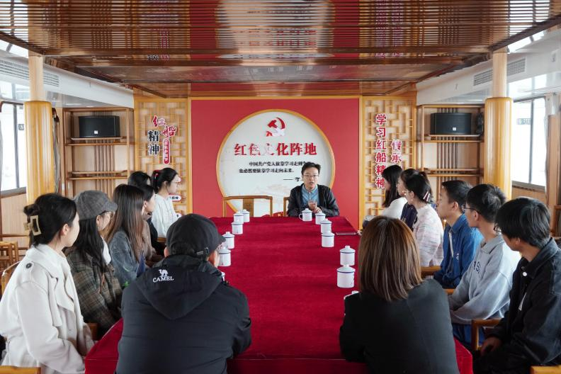 随后,讲解员带领成员们来到户外甲板,介绍了“武汉红”主题船的“红船精神”及其在中国革命史中的重要意义。走进二楼展览馆,浓厚的“红船精神”扑面而来。在互动环节中,“武汉红”主题船的康老师向宣讲团成员们表示了热烈欢迎,并倾听了大家的感受与意见,让红色文化在长江之滨更加璀璨。